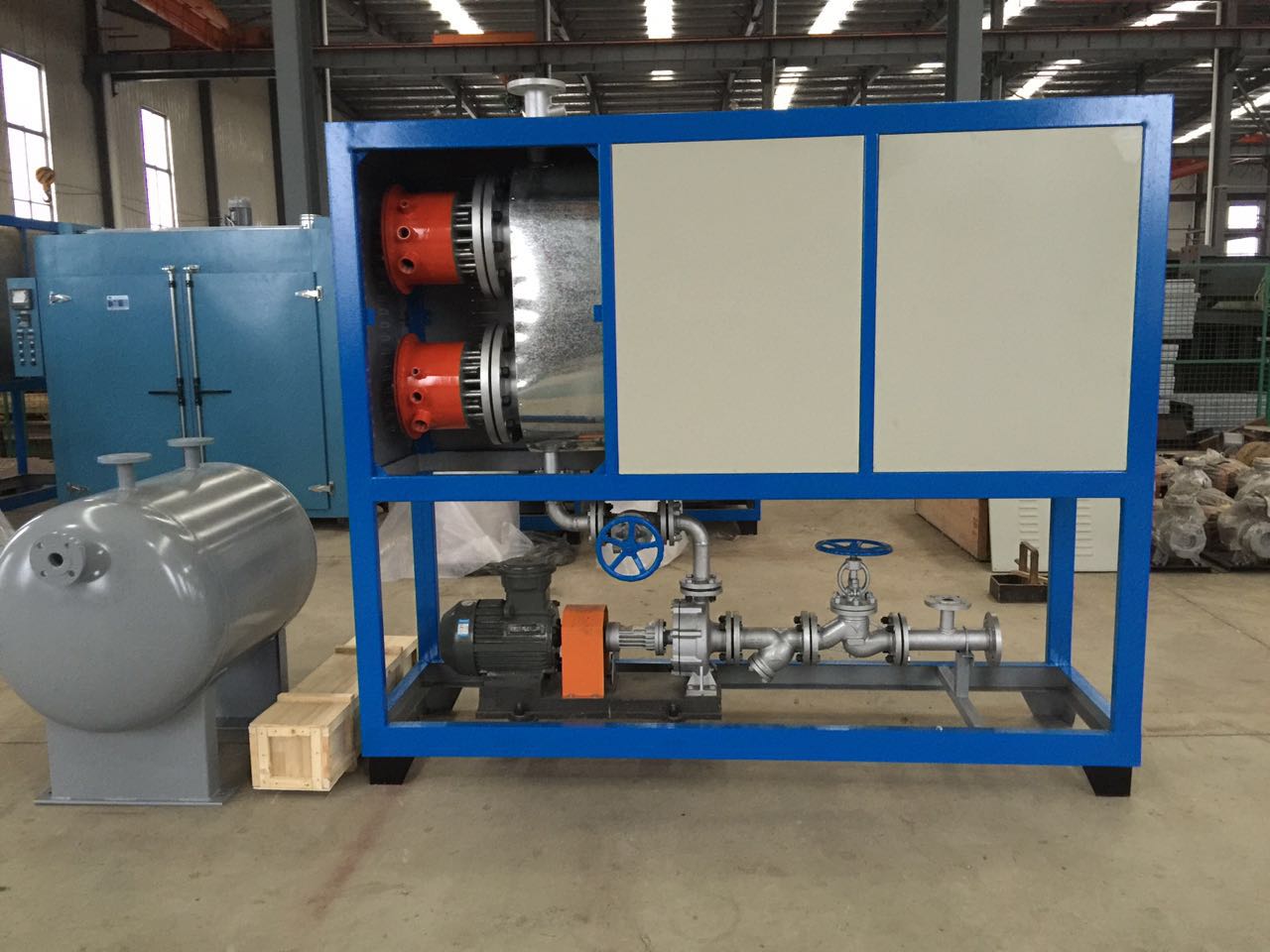 導熱油爐排氣流程: 1、導熱油通過膨脹槽注油口處加注,并通過膨脹口管道流入設備及油爐本體內(nèi),此時注油時一定要打開系統(tǒng)中所有的閥門(放油閥除外),讓導熱油流入筒體及需加熱設備內(nèi)。 2、當液面顯示約為膨脹槽高度1/2時,停止注油。 3、首 行常溫排氣:接通電源,打開導熱油加熱器的進出口閥門及排氣閥(膨脹管道閥門需一直開著以及時補充油量),按動油泵啟動按鈕,油泵運行,油泵應按箭頭指示方向正常運行,壓力表壓力顯示在規(guī)定范圍內(nèi),視聽油泵運行情況,如有異常現(xiàn)象應立即停機檢查,將故障排除后再重新起動油泵,進行常溫下排氣,直至壓力表指示穩(wěn)定。進行常溫排氣時,要注意觀察膨脹槽內(nèi)的液位,當?shù)陀谝?guī)定的液位高度時要及時進行補充。 4、升溫脫水:在確認常溫下運行正常后,即可進行升溫脫水排氣(操作前詳閱導熱油使用說明書及溫控儀使用說明書),升溫脫水排氣可按如下步驟進行: 步:升溫至100-120℃保溫 開始升溫時,應該控制升溫速度在50℃/h以內(nèi),并且監(jiān)視壓力表顯示是否正常,如發(fā)現(xiàn)無壓力或壓力不穩(wěn),說明系統(tǒng)內(nèi)仍有殘留氣體,此時要求按3要求重復進行常溫排氣操作,待系統(tǒng)壓力穩(wěn)定后方可繼續(xù),升溫至120℃后進行長時間保溫,保溫時間的長短與系統(tǒng)總?cè)萘考皩嵊偷馁|(zhì)量有關。  第二步:升溫至150-180℃保溫。  排除油中輕組分、揮發(fā)物及殘余水分,請參照KRD系列導熱油加熱器系統(tǒng)脫水排氣曲線圖操作 第三步:脫水排氣完成后要關閉排氣閥(其它閥門無需關閉),投入正常升溫運行。 5、 升溫脫水排氣過程有關事項。 升溫過程中管路可能會發(fā)出碰擊的響聲,說明系統(tǒng)內(nèi)有大量氣體或管道不暢,此時要降低升溫速度,待氣體排除便可消除聲響;如系管道不暢所至應予以排除。 脫水排氣過程可能會有大量氣體涌入膨脹槽,造成槽內(nèi)導熱油外溢,操作前要在溢油管下安置好溢油容器。 進行脫水排氣時,現(xiàn)場必須有人員看守,發(fā)現(xiàn)異常及時處理。   對于所提的油泵無油或少許油流出的問題,解決方案如下: 1、 關閉出油口閥門,啟動油泵,觀察壓力表顯示情況,若無壓力,則說明回油口無油補充油泵,使得油泵空轉(zhuǎn),無后續(xù)油及時補充,則請貴司檢查一下回油口的供油情況,此時請確保膨脹槽里有油并膨脹管道閥門打開和需熱設備有油并出油口閥門在打開狀態(tài)。 2、 如果以上要求都執(zhí)行到位,壓力表還無壓力,請檢查油爐上的油泵、截止閥及過濾器是否堵塞。 3、 若壓力表顯示壓力值,而油泵、截止閥及過濾器并無堵塞,那油爐的出油口一定會按油泵所提供的流量進行流出。